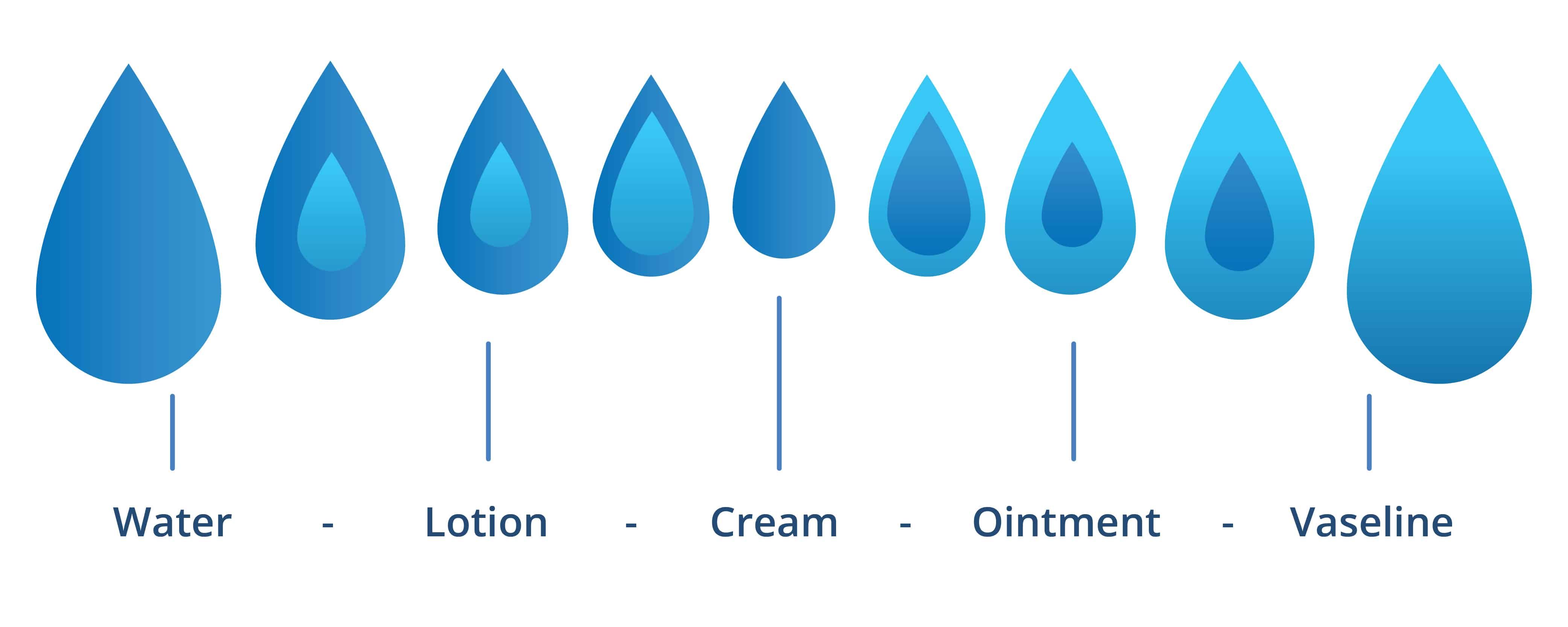 Apart from the ingredients in a topical preparation, it is important for you to understand the different compositions of topical preparations, which usually consists of water, petrolatum, or a combination of both (refer to figure below). Water on its own is a weak moisturiser, as it tends to evaporate fast. At the other end of the spectrum, petrolatum is a substance which has the ability to prevent 99% of trans-epidermal water loss. Due to its thickness, it becomes a poor medium for bacteria growth, thus reducing the effects of preservatives and chemicals, leading to less irritation. However, due to its oily consistency, certain individuals may not be able to tolerate its application on their skin, which may contribute to hair follicle occlusion that leads to inflammation.