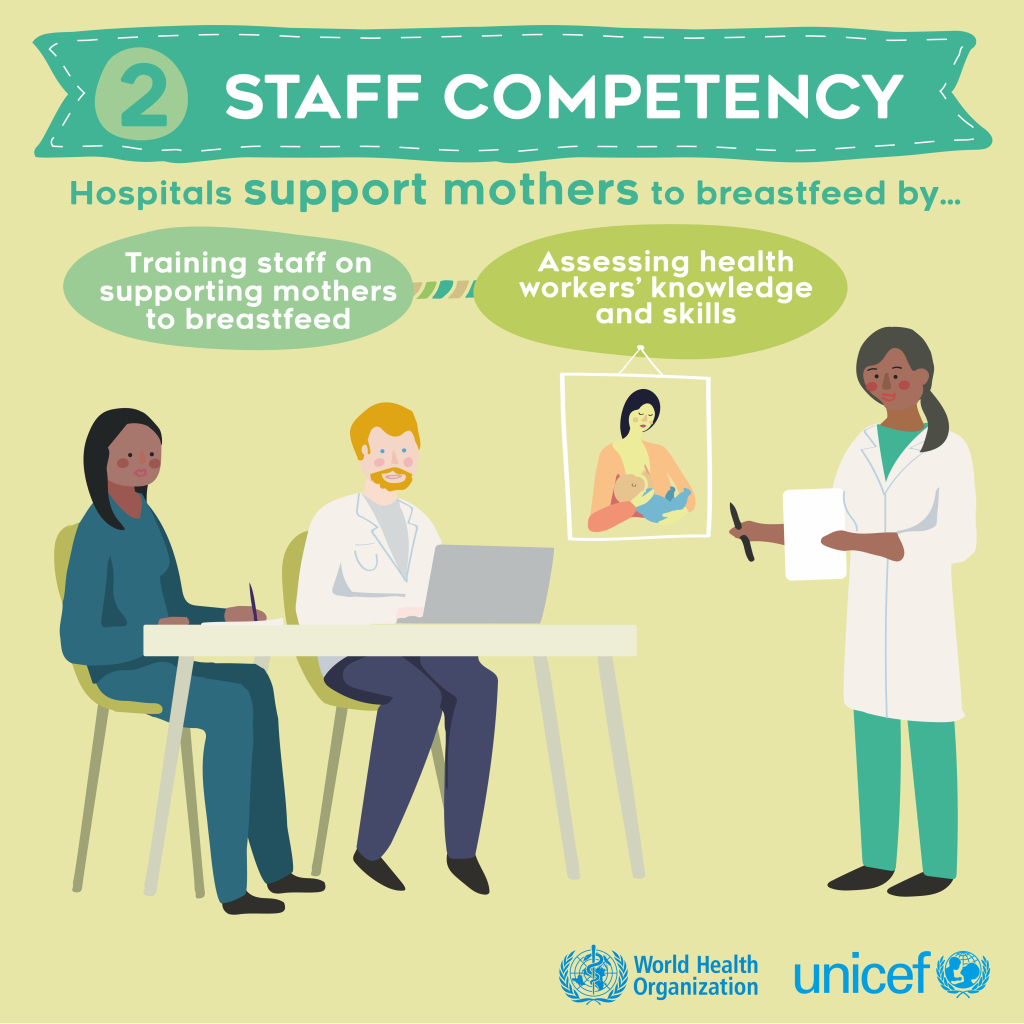 2. Memastikan kakitangan mempunyai pengetahuan, kecekapan dan kemahiran yang mencukupi untuk menyokong penyusuan susu ibu.