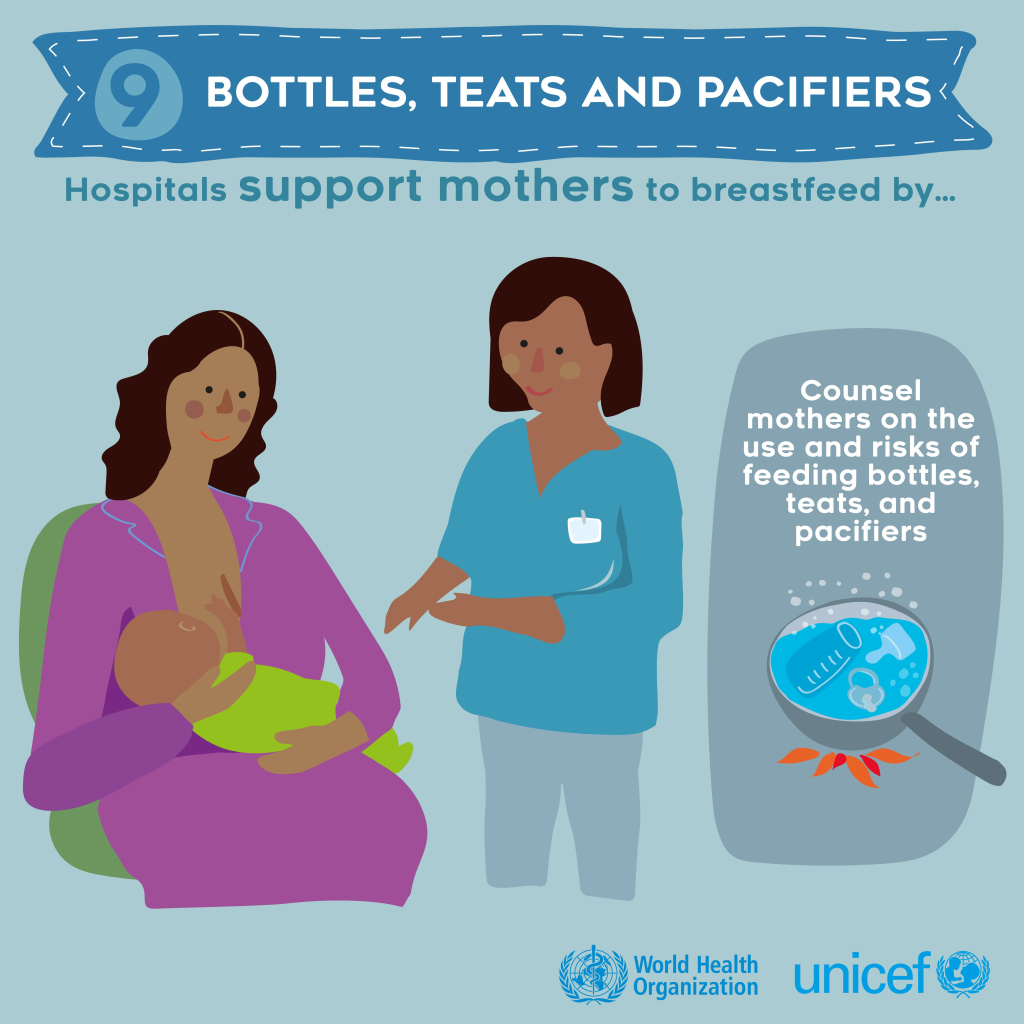 9. Menasihati para ibu mengenai risiko penggunaan botol susu, puting botol dan puting kosong.