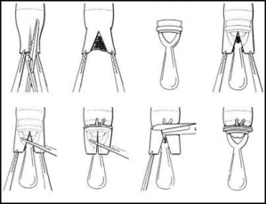 Selepas kulit preputial dipotong sedikit, alat plastibel akan dilekapkan pada kepala zakar. Benang seterusnya dijerutkan pada lekuk plastibel dan lebihan kulit preputial dibuang.