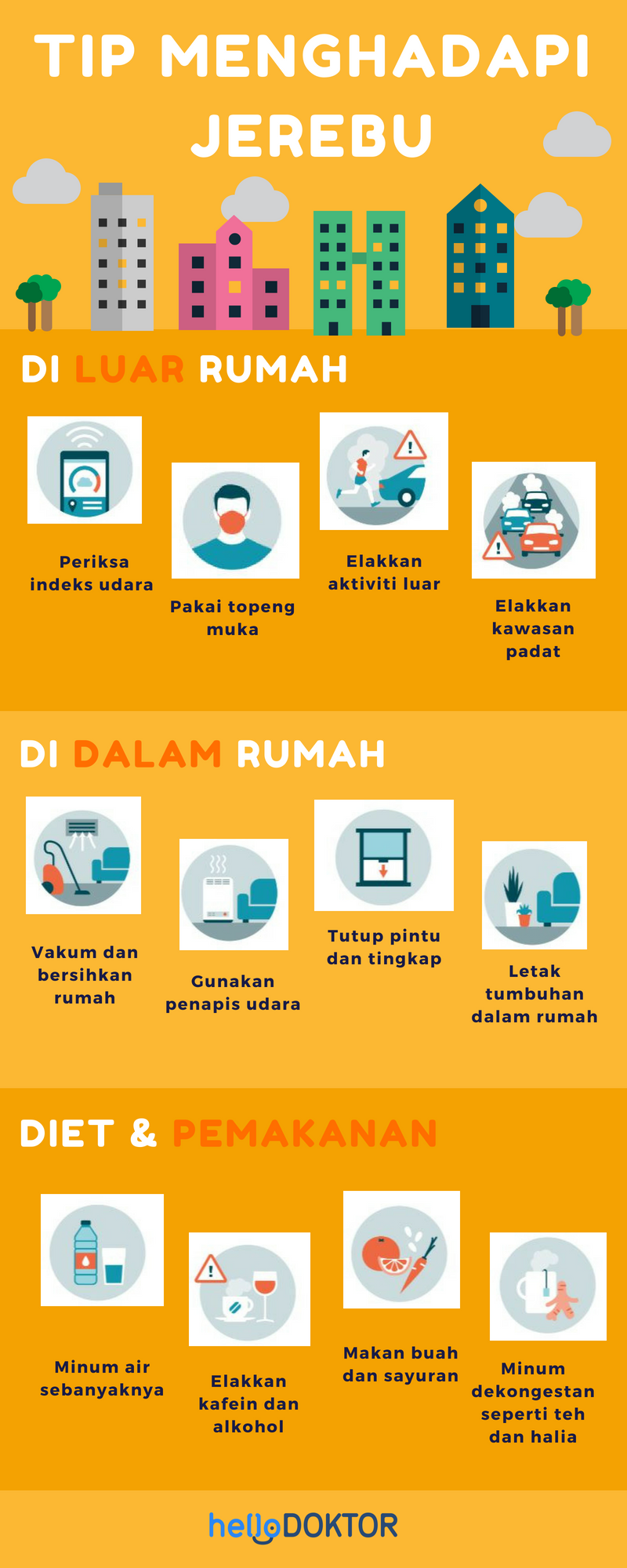 Pencemaran udara boleh menyebabkan kesan buruk kepada kesihatan manusia. Pertubuhan Kesihatan Sedunia (WHO) telah menamakan pencemaran udara sebagai risiko kesihatan alam sekitar terbesar di dunia. Dalam menghadapi musim jerebu yang bakal berulang lagi, terdapat 3 langkah pencegahan utama iaitu dengan mendidik diri sendiri tentang masalah jerebu, ubah aktiviti harian anda untuk mengelakkan kesan lebih buruk dan amalkan diet sihat supaya badan anda dapat membaiki diri setelah terdedah kepada kesan jerebu. Oleh itu, amalkan tip berikut untuk menangani masalah jerebu: