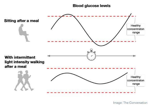 Pelbagai kajian telah menunjukkan bahawa mengurangkan dan menggantikan duduk dengan berjalan meningkatkan kawalan glukosa selepas pengambilan makanan. Ini bermakna tahap glukosa tidak terlalu tinggi atau terlalu rendah. Ini boleh dijelaskan dengan cara otot berfungsi boleh menggunakan beberapa glukosa dalam sistem, membantu untuk menjaga glukosa dalam julat optimum.